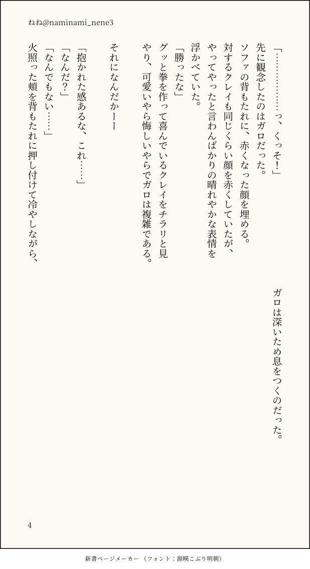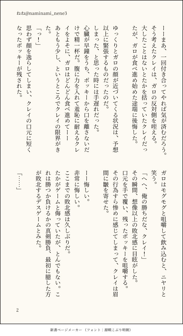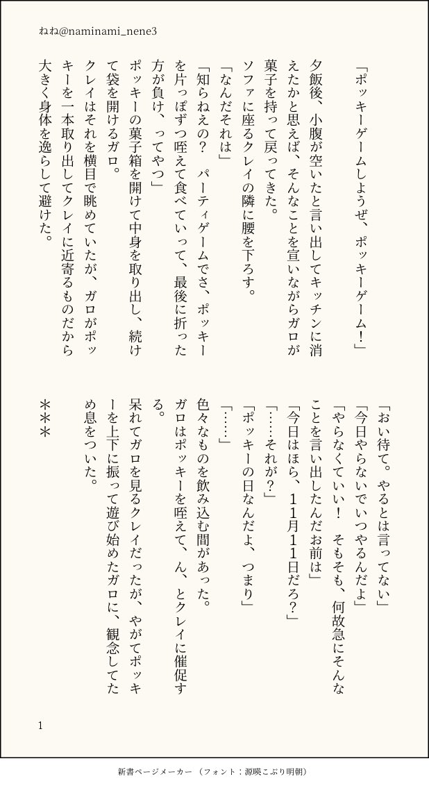 ◇z09:MATOI=keshi〼2019年11月11日読了時間: 1分 負けず嫌いに火が付くクレイと、ドギマギするガロでポッキーゲーム ねね様https://twitter.com/naminami_nene3
